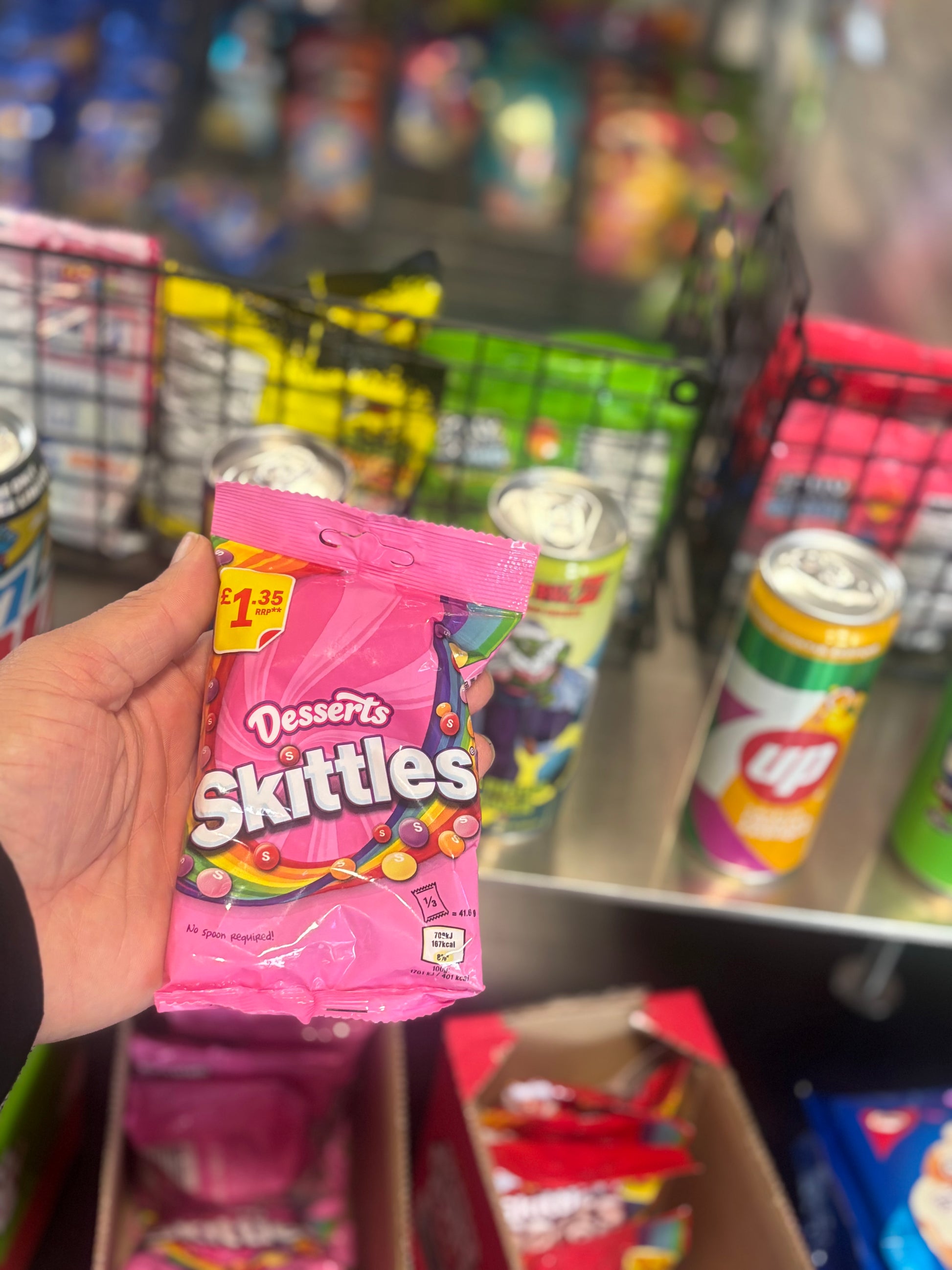Skittles Desserts from the UK are a limited edition flavor variety that combines the classic Skittles experience with the taste of popular British desserts. Flavors include Strawberry Ice Cream, Choco-Orange Cake, Blueberry Tart, Cherry Cheesecake, and Lemon Pie. These candies offer a unique twist on the traditional Skittles, providing a mix of fruity and dessert-inspired tastes in each bite